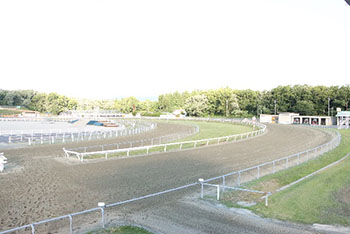 向こう正面の山肌を一部造成し設置したウッドチップ敷き坂路走路(平成20年完成、助走路350m、3%勾配300m、5%勾配70m)は、騎手候補生の訓練だけでなく、外部育成事業者や認定外厩馬の調教にも活用されています。