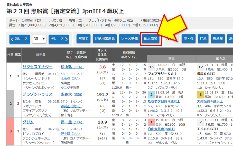 当該レースの「出馬表」より(競走成績)ボタンをクリックしてください。