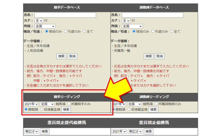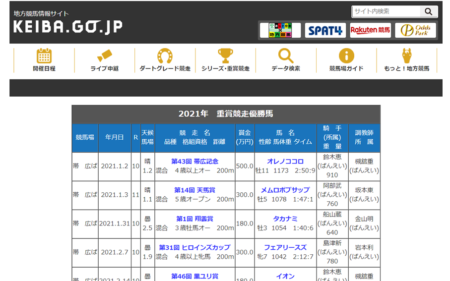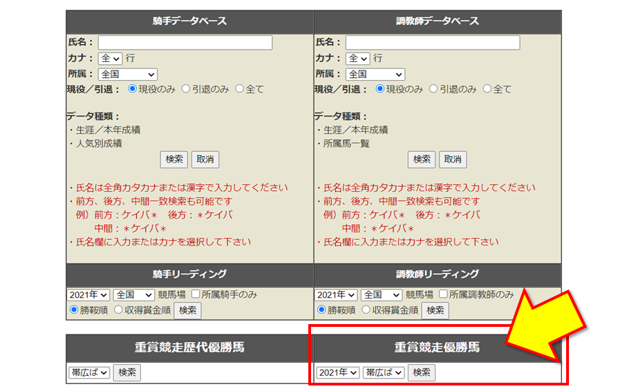 「データ検索」では、各競馬場における重賞競走の優勝馬一覧や成績がご確認いただけます。