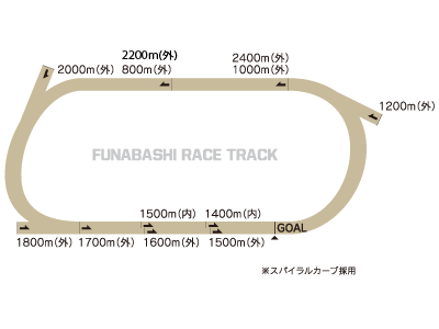 1周1400m左回りで、内回り、外回りの2種類のコースがあり、コーナーの内外に高低差を付けたスパイラルカーブを採用した南関東4競馬場で唯一のコースとなっております。