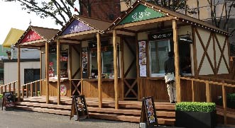 ログハウス風の店舗が立ち並ぶ『スイーツステーブル』!ここでしか食べられないTCK限定スイーツなども多数取り揃えております。競馬予想で使った頭をあま~いスイーツでリフレッシュ!