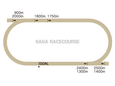1周1100mの右回りで、高低差は1mとほとんど平坦。 佐賀競馬場の砂はほかの競馬場に比べて粒が大きく、パワーがある馬のほうが有利という傾向があります。