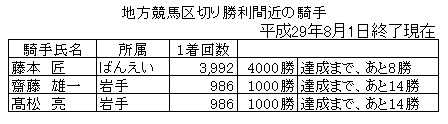 8月1日(火)終了時点で、区切り勝利が近い騎手は、以下のとおりです。