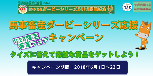 畜産関係団体で構成され、畜産や畜産物の普及啓発(畜産フェア等)など諸活動を実施している馬事畜産振興協議会(事務局:公益社団法人 中央畜産会)では、国際養鶏養豚総合展2018(IPPS)及びダービーシリーズ2018 それぞれの開催を記念した競馬&畜産コラボ企画として、簡単なクイズとアンケートにご回答いただいた方を対象に、ダービーシリーズ開催競馬場所在地のご当地畜産物や、名古屋競馬場の特別観覧席指定席券など素敵な賞品が当たる“WEB限定畜産フェア”「馬事畜産ダービーシリーズ応援キャンペーン」を以下のサイトで実施します(実施期間:6月1日~23日)。