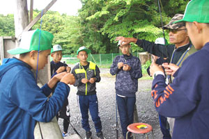 | 釣り竿を持ってハイ、チーズ☆ | スタッフさんが使い方を 丁寧(ていねい)に教えてくれました。 |