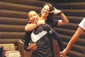 細川先生の剛腕(ごうわん)に捕まった飛田君。 きっと何か悪いことをしたのでしょう・・・(笑) |