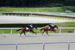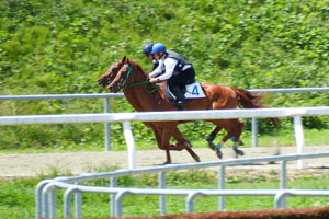 前回の課題であったゲート内での準備は、今回はスムースに行うことが出来ました。初めて2頭で行いましたが、内枠の馬との間隔がつかめず、外に膨らんでしまいました。直線では、手綱のつめかえが遅れてしまい、追い込みが直線半ばからになってしまいました。次回は、併走馬から離れずに走行し、直線に入ったらすぐに追えるようにします。
