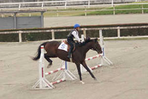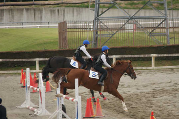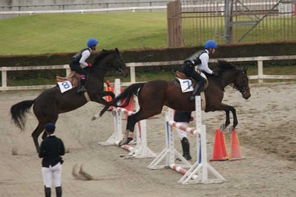 カドリールの次は、2人1組で障害飛越を行いました。2人が交差するように障害を飛越し、2頭併せて連続した5つの障害を飛越しました。