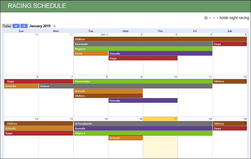 カレンダー上にそれぞれ色分けされた開催競馬場が表示され、開催場が一目で分かります。