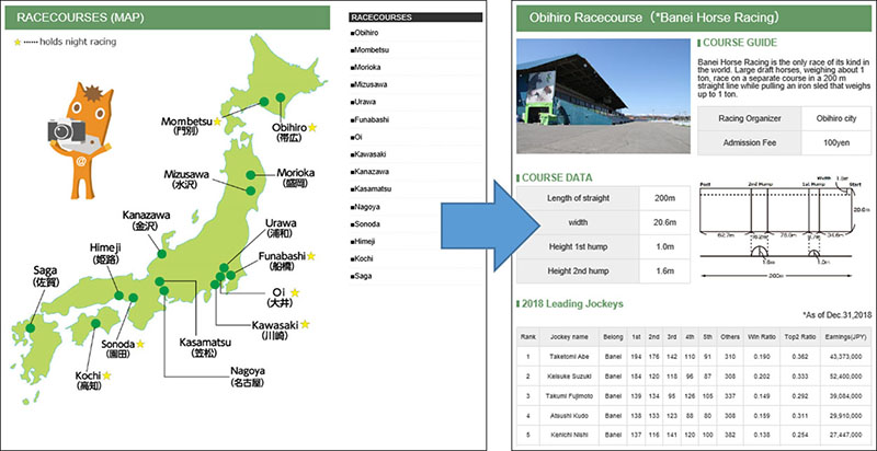 日本地図上に各地方競馬場が表示されており、選択するとそれぞれの競馬場のアクセス方法など様々な概要を知ることができます。