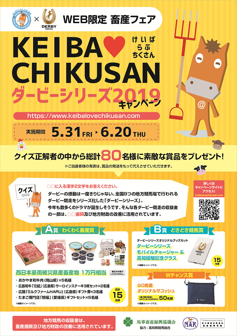 畜産関係団体で構成され、畜産や畜産物の普及啓発(畜産フェア等)など諸活動を実施している馬事畜産振興協議会(事務局:公益社団法人 中央畜産会)では、簡単なクイズとアンケートに回答いただいた方を対象に、西日本豪雨被災県産畜産物や、ダービーシリーズオリジナルグッズなど素敵な賞品が抽選で当たる“WEB限定畜産フェア”「KEIBA LOVE CHIKUSAN ダービーシリーズ2019キャンペーン」を以下のサイトで実施します(実施期間:5月31日~6月20日)。