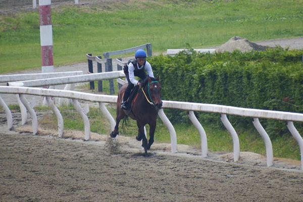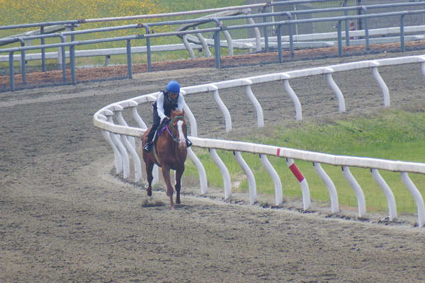 今回の“馬なり”訓練とは、内ラチ走行で向正面から徐々にスピードを上げていき、直線で馬を速く走らせる訓練です。