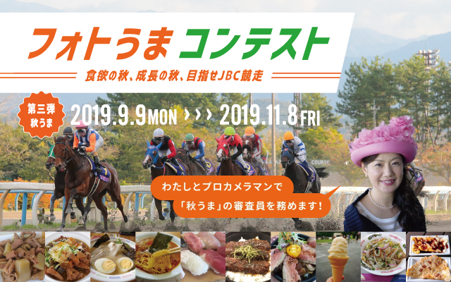地方競馬場内で撮影した風景や馬、人物など、SNSに投稿いただいた写真から優秀作品を決めるSNSキャンペーン「フォトうまコンテスト」の3rdシーズン・『秋うま』が本日より開始いたしました!! 『秋うま』の撮影テーマは「食欲の秋、成長の秋、目指せJBC競走」となっておりますので、地方競馬場グルメまたはJBC競走に出走して欲しい競走馬の写真を撮影し、豪華グッズの当たるキャンペーンにぜひご参加ください。