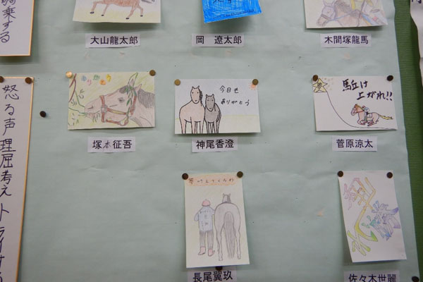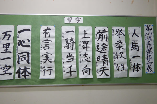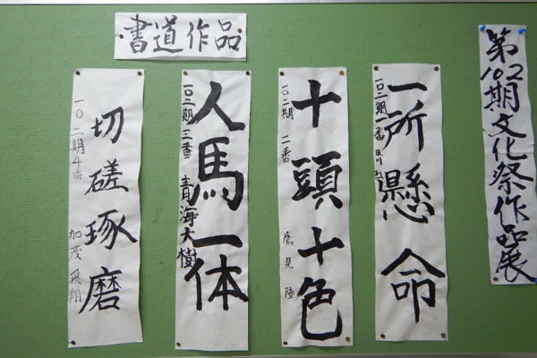 文化祭は、100期生の先輩を除いた101期、102期生が一般教養の授業の一環で作成した①絵手紙、②家族への手紙、③習字、④俳句、⑤調理へラの5点について、作品を展示して、先生方の投票で1位を決めました。