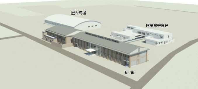 地方競馬からのお知らせ 2020/06/09 地方競馬教養センター新館建設工事のお知らせ 地方競馬教養センター(栃木県那須塩原市)では、騎手養成の充実を図るため、現在の研修館、体育館等を取り壊した跡地に、視聴覚を備えた教室やトレーニングルームなどの教育施設、研修施設、体育館及び事務所や会議室などの機能を統合した新たな建物(新館)の建設工事を令和2年4月から始めています。 新館のグランドオープンは、令和4年3月を予定しています。 【新館のイメージ図】