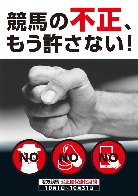 地方競馬からのお知らせ 2020/10/01 公正確保強化月間について 地方競馬全体が競馬の公正確保の意識を高めることを目的として10月を「公正確保強化月間」と定め、地方競馬の全主催者が厩舎地区の管理徹底・再点検ほか、公正確保に係る共通の取組みを行います。 2020年度 地方競馬公正確保強化月間ポスター