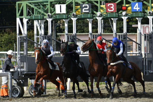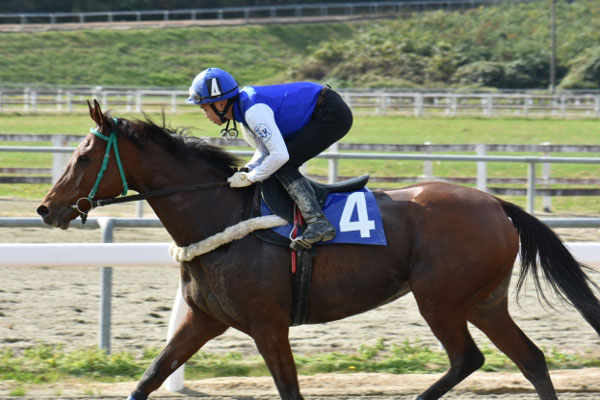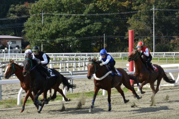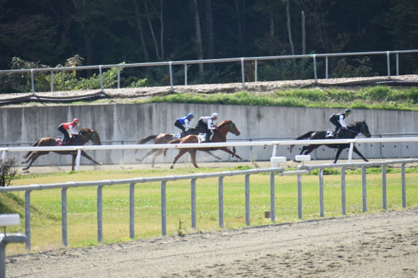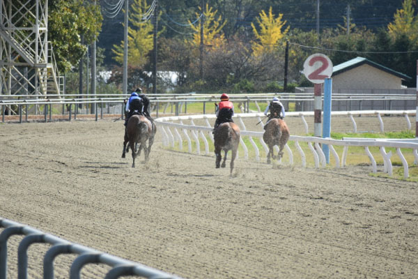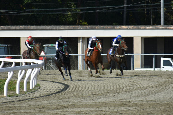 10月28日に行われた競走実習は、前回と回り方が逆の右回り1300mのレースを行いました。内容としては、ゲート発進から4騎で集団を形成し、直線ではハンドライド(※)とステッキを使って追い込むという内容でした。