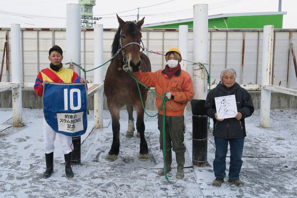 服部義幸調教師(ばんえい)は、12月19日(土)の帯広競馬第2競走をオニカゲで優勝し、1985年4月の初出走以来、23,481戦目にして地方競馬通算2,500勝を達成しました。