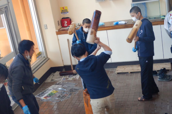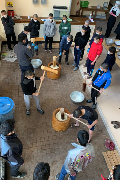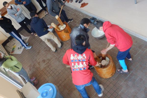 美味しいお餅にするために、もち米をみんなでついていきます。