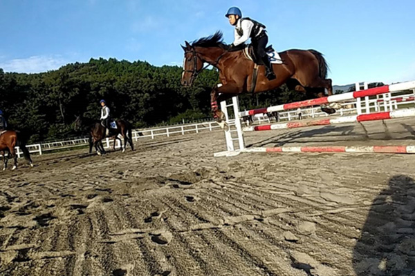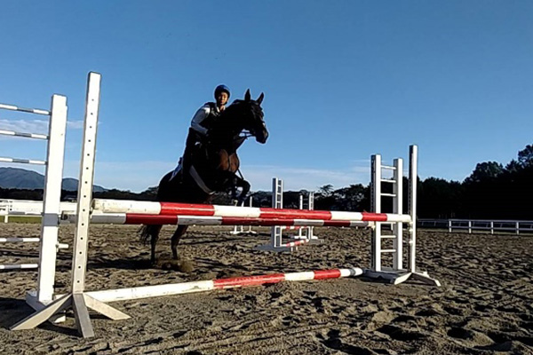 練習よりも脚で挟みながらいいペースを作って乗ることが出来ました。しかし、まだ伏せ拳になったり、飛んだ後の戻りが悪かったりするので、今後の訓練の中で意識して乗っていきたいと思います。